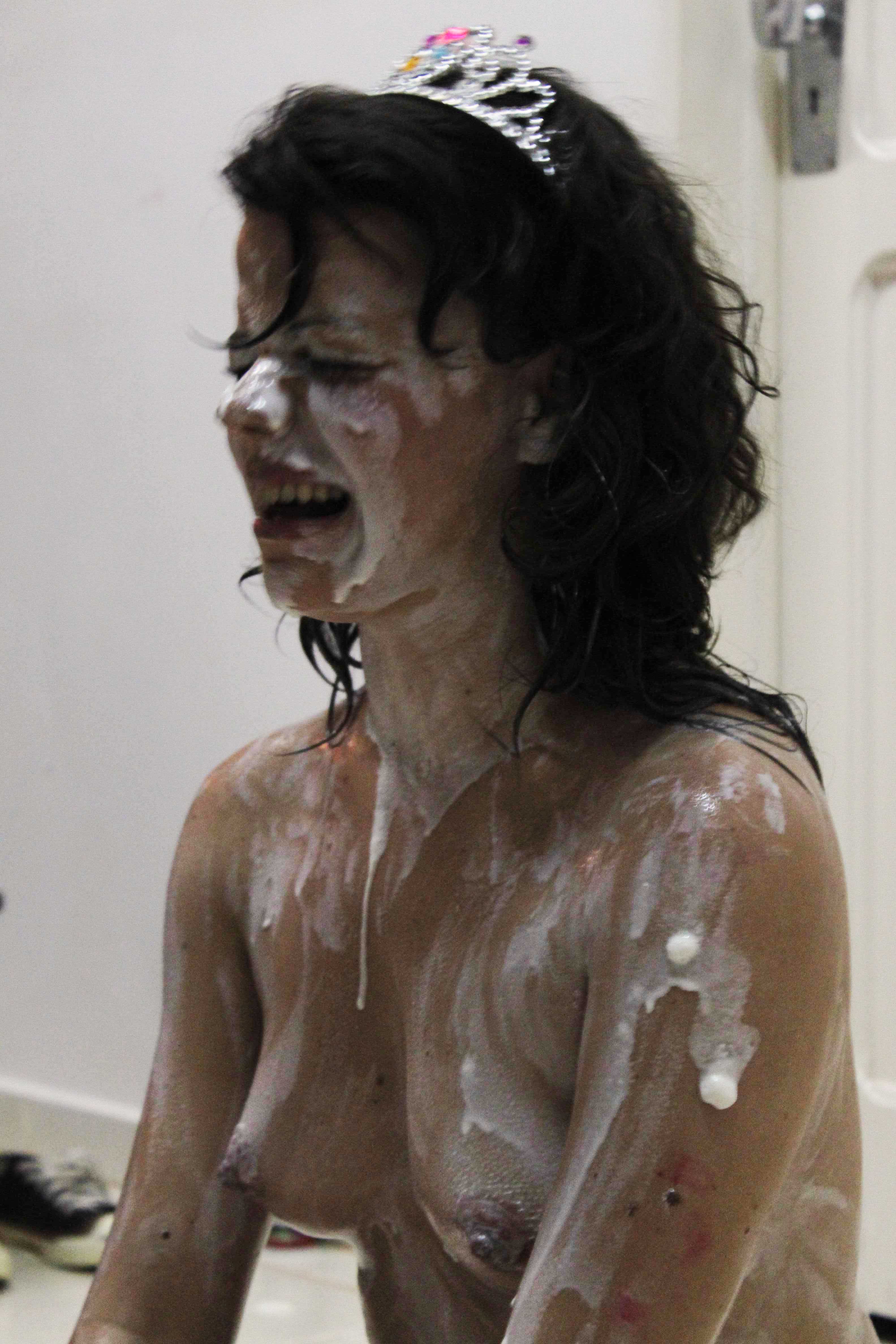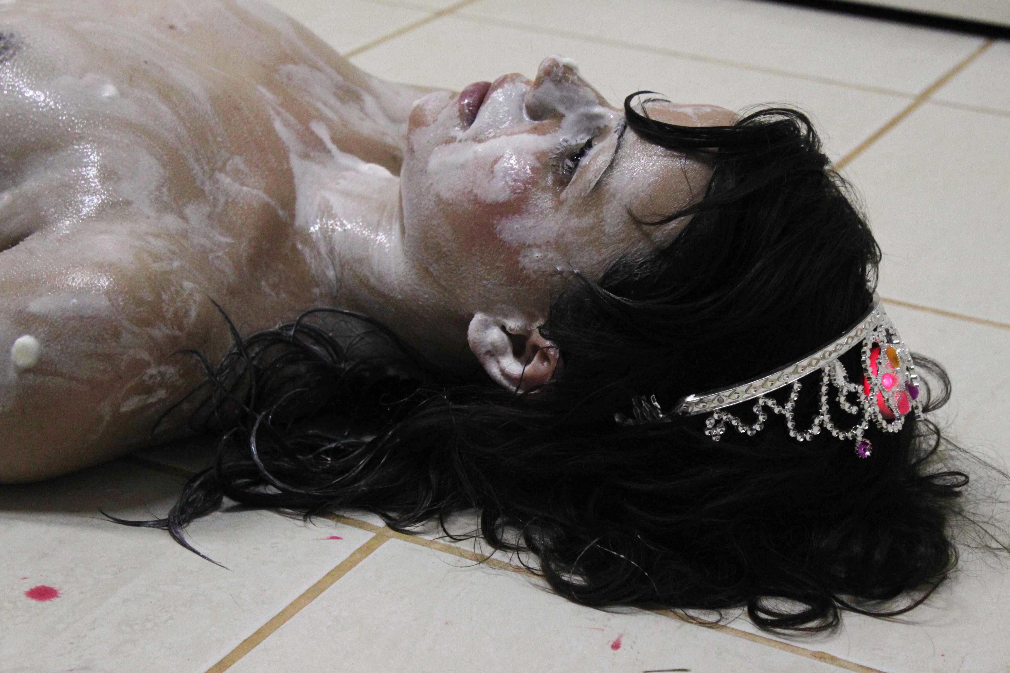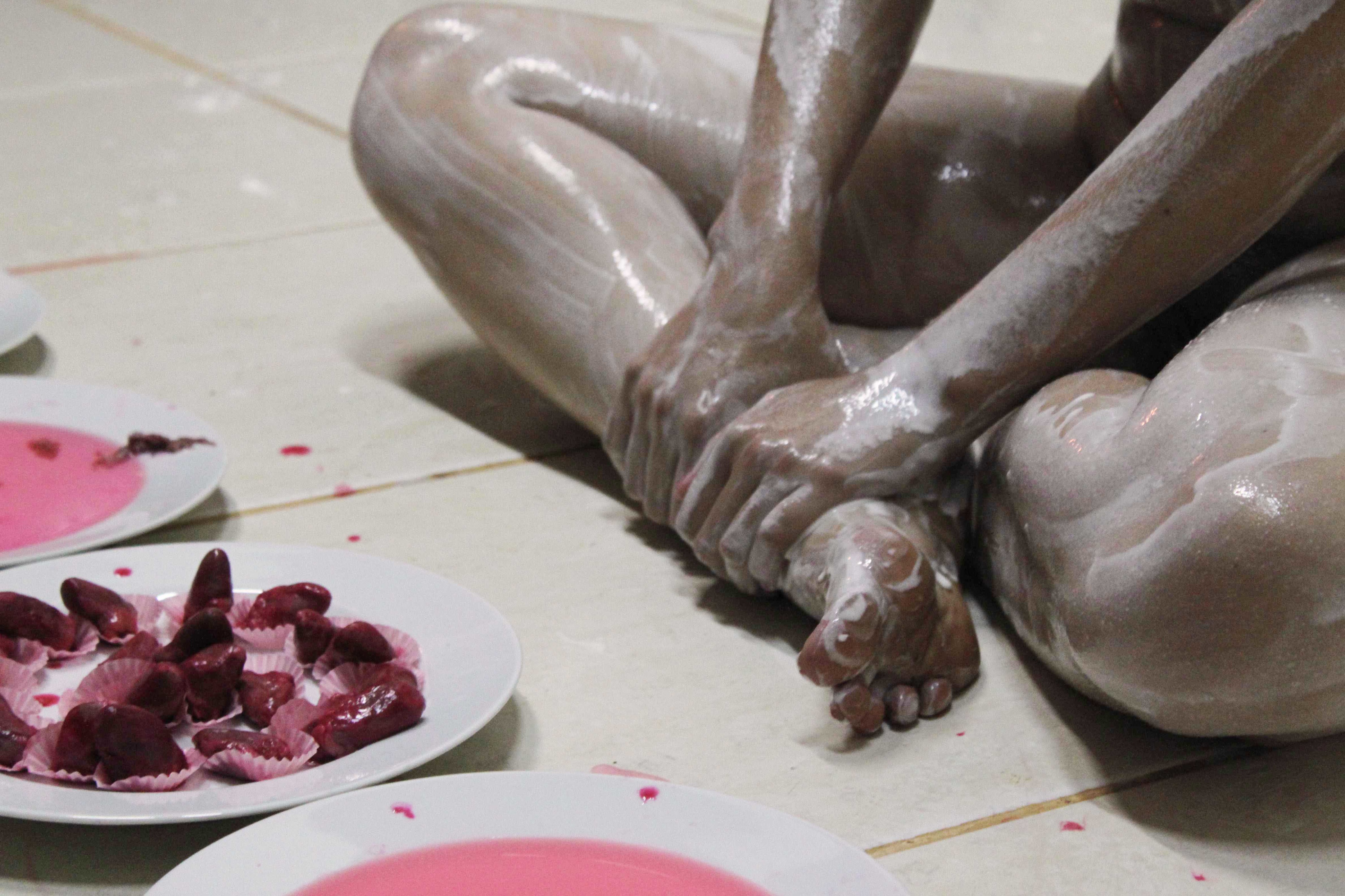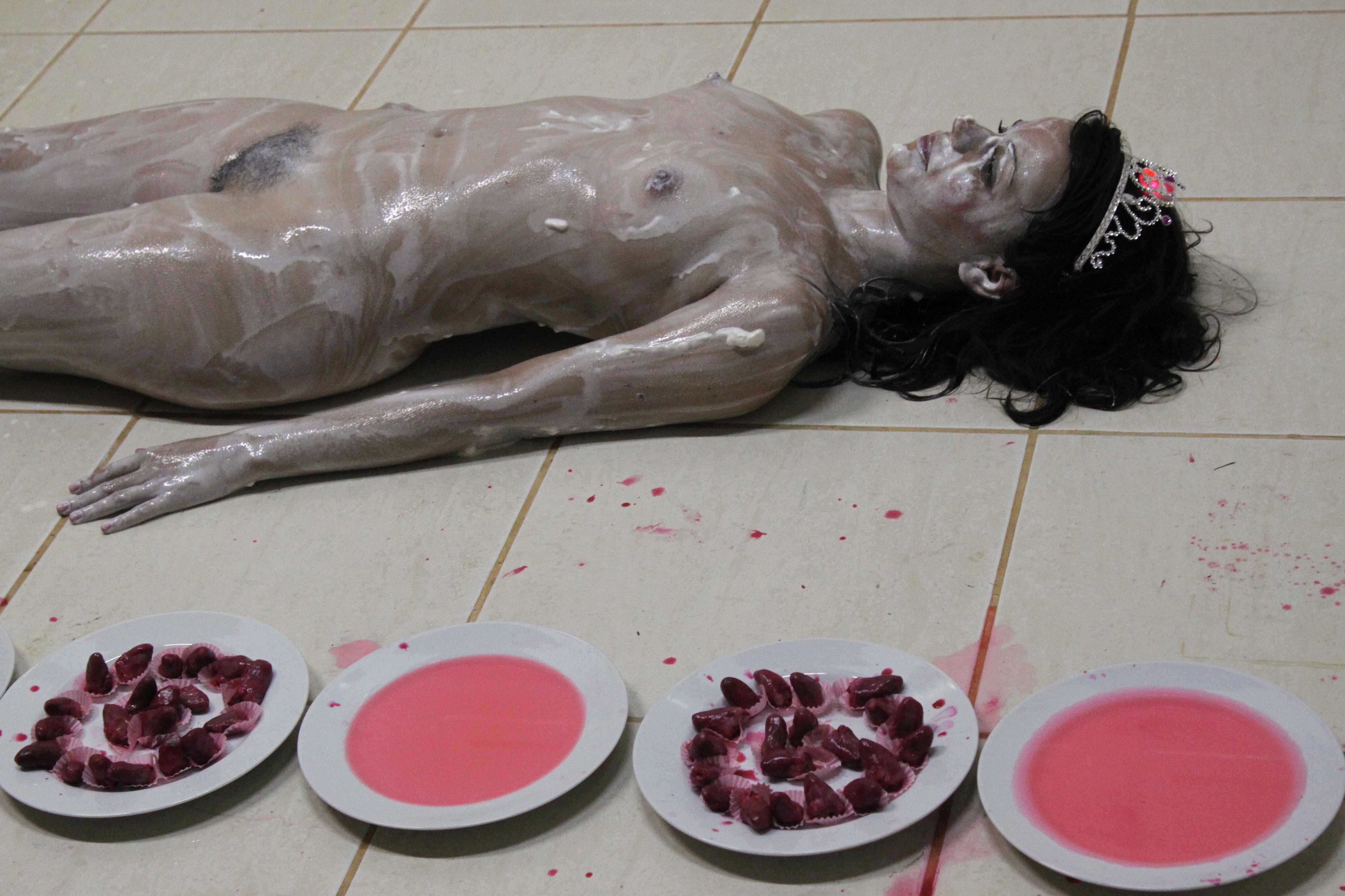 Quando a música começar a tocar, está dada a largada. Para satisfazer seus desejos, será permitido que você (vocês) dê (dêem) uma lambidinha no chantilly que está sobre o meu corpo. Mas isso não acontece sem conseqüências: para cada lambidinha que levar, eu comerei um desses corações crus de galinha que estão aqui à minha frente, e progressivamente: para a primeira lambida, um coração comido. Para a segunda, dois. Para a terceira, três - e assim sucessivamente. Peço a gentileza de que apenas uma pessoa por vez venha até mim, de modo que eu possa comer os corações referentes a essa lambida antes de levar a próxima. O jogo acaba quando acabar a música, que está num looping de 20 minutos.